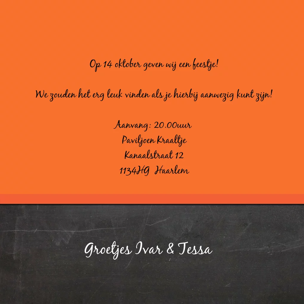 Uitnodiging voor een feestje met een foto van bloemen en een krijtbord onderkant en een stoer grijs label.