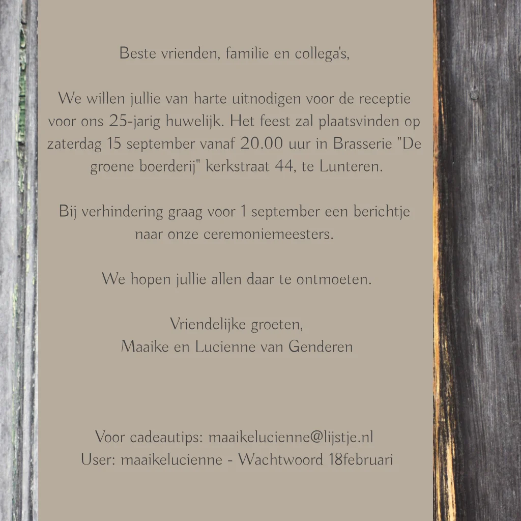 Sfeervolle jubileumkaart met hout voor zilveren huwelijk met karakter. Vervang de voorbeeldfoto en tekst op deze uitnodiging.