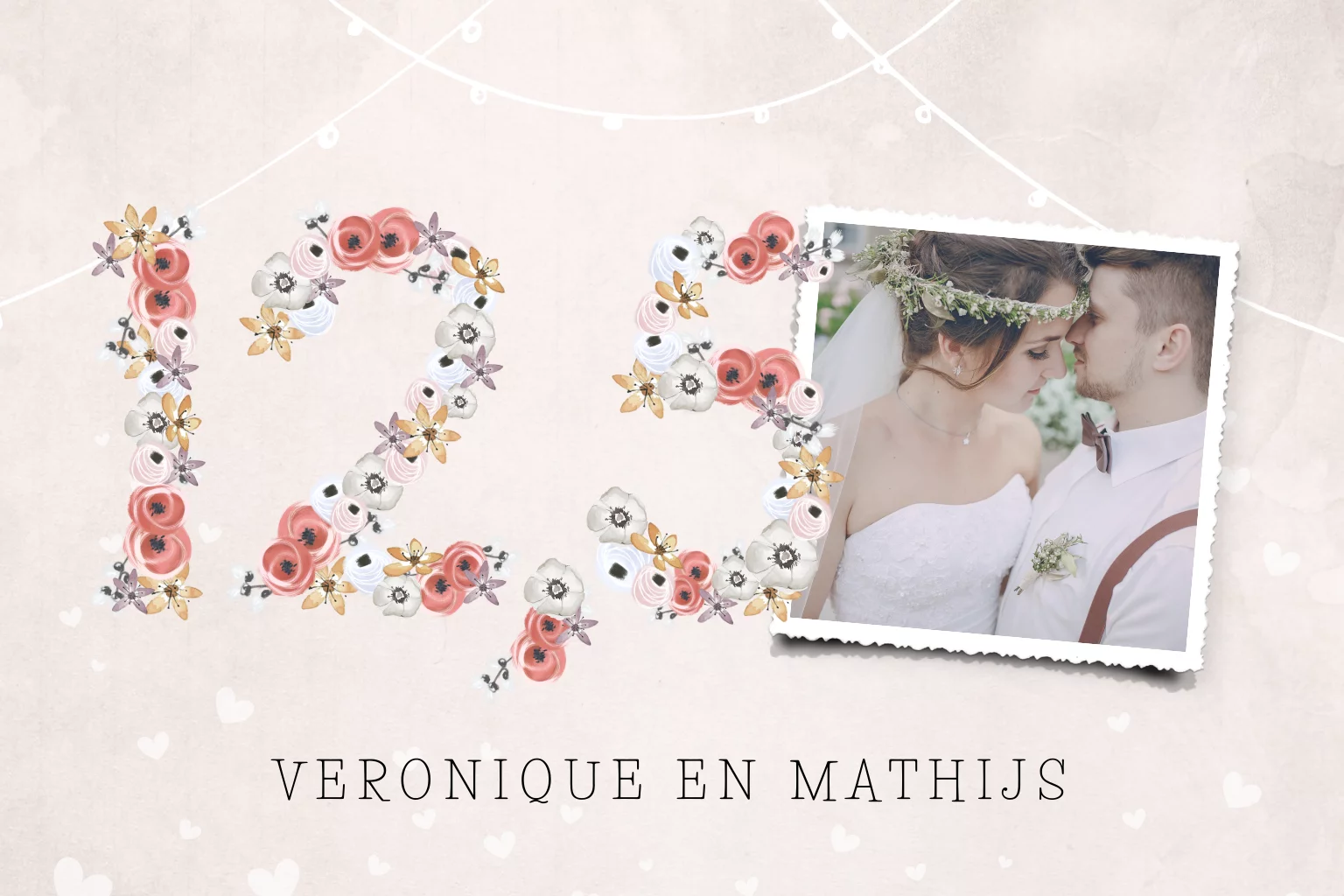 Deze uitnodiging voor jullie huwelijksjubileum is extra sierlijk door toevoeging van de bloemen. Maak de kaart extra persoonlijk door een foto van jullie toe te voegen.