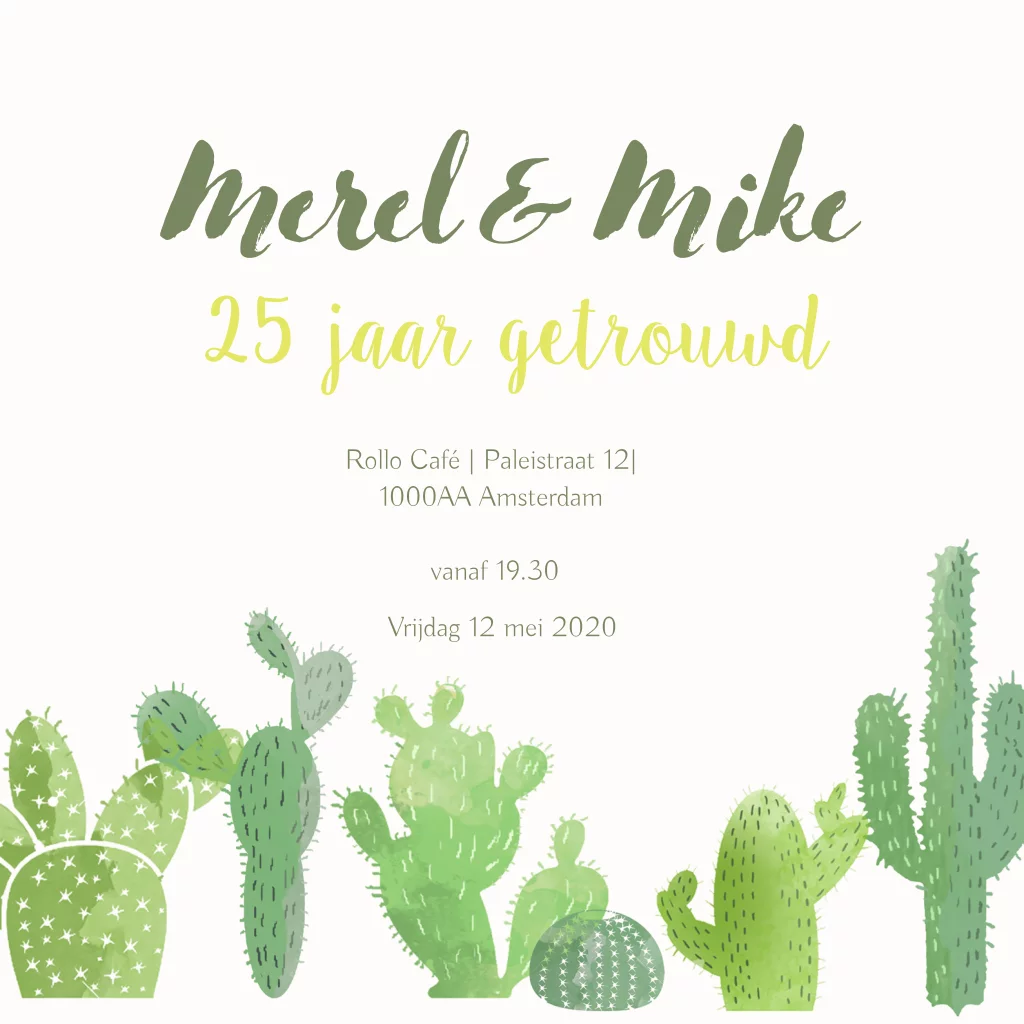 Hippe huwelijks jubileumkaart met cactus in prachtig groen. Een feestelijke kaart om jullie 25 jarig huwelijksfeest groots aan te kondigen.