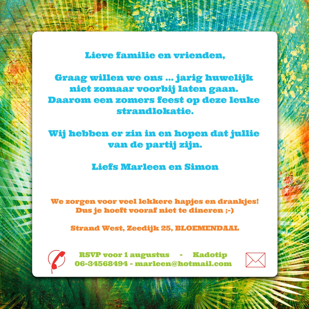 Vrolijke jubileumkaart in tropische kleurstelling. De binnenzijde is voorzien van een fotoframe waar je jullie mooiste foto in kunt plaatsen.