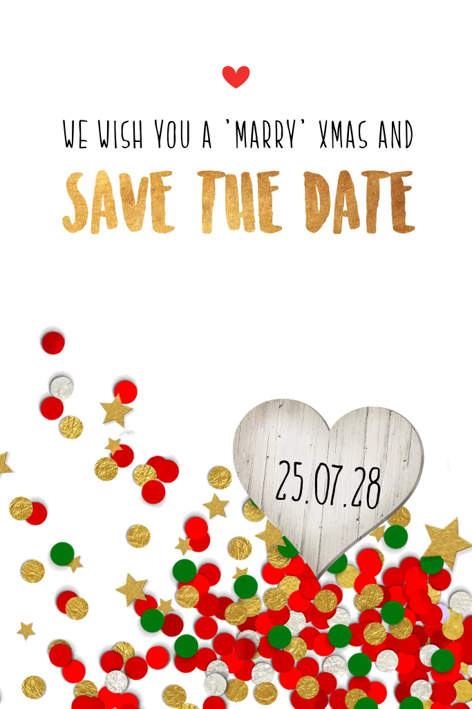 Kerst Save the Date kaart met gouden letters en confetti in kerstkleuren. Met een houten hartje op de voorkant waarin je jullie trouwdatum kunt plaatsen. Laat iedereen weten dat jullie bruiloft eraan komt. Gaaf met een gouden envelop.