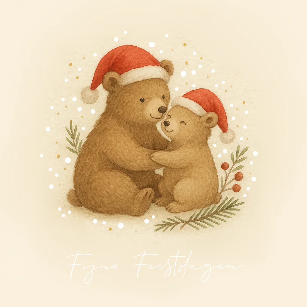Deze aquarel kerstkaart straalt meteen warmte uit door de twee knuffelende beertjes met hun kerstmutsjes. Deze sfeervolle en unieke kerstkaart heeft een klassieke uitstraling. Als je een feestdagen kaart zoekt die rustig, lief en toch bijzonder is, dan past dit ontwerp perfect bij jouw stijl.