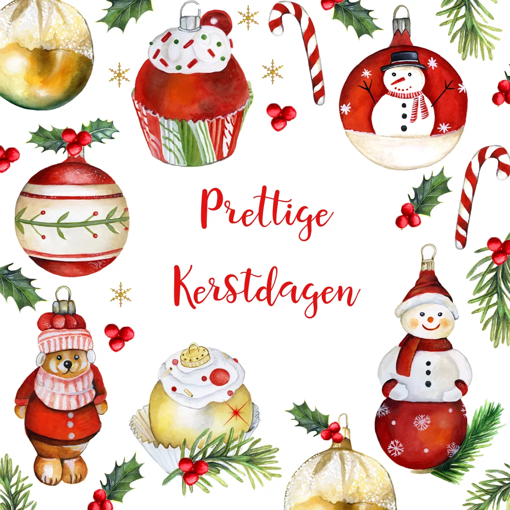 Kerst met leuke kerstornamenten zoals cupcakes en sneeuwpopjes en beertje