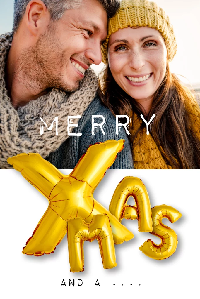 Vrolijke hippe kerst en nieuwjaarskaart met gouden ballonnen XMAS en 2024. En natuurlijk jullie eigen foto's.