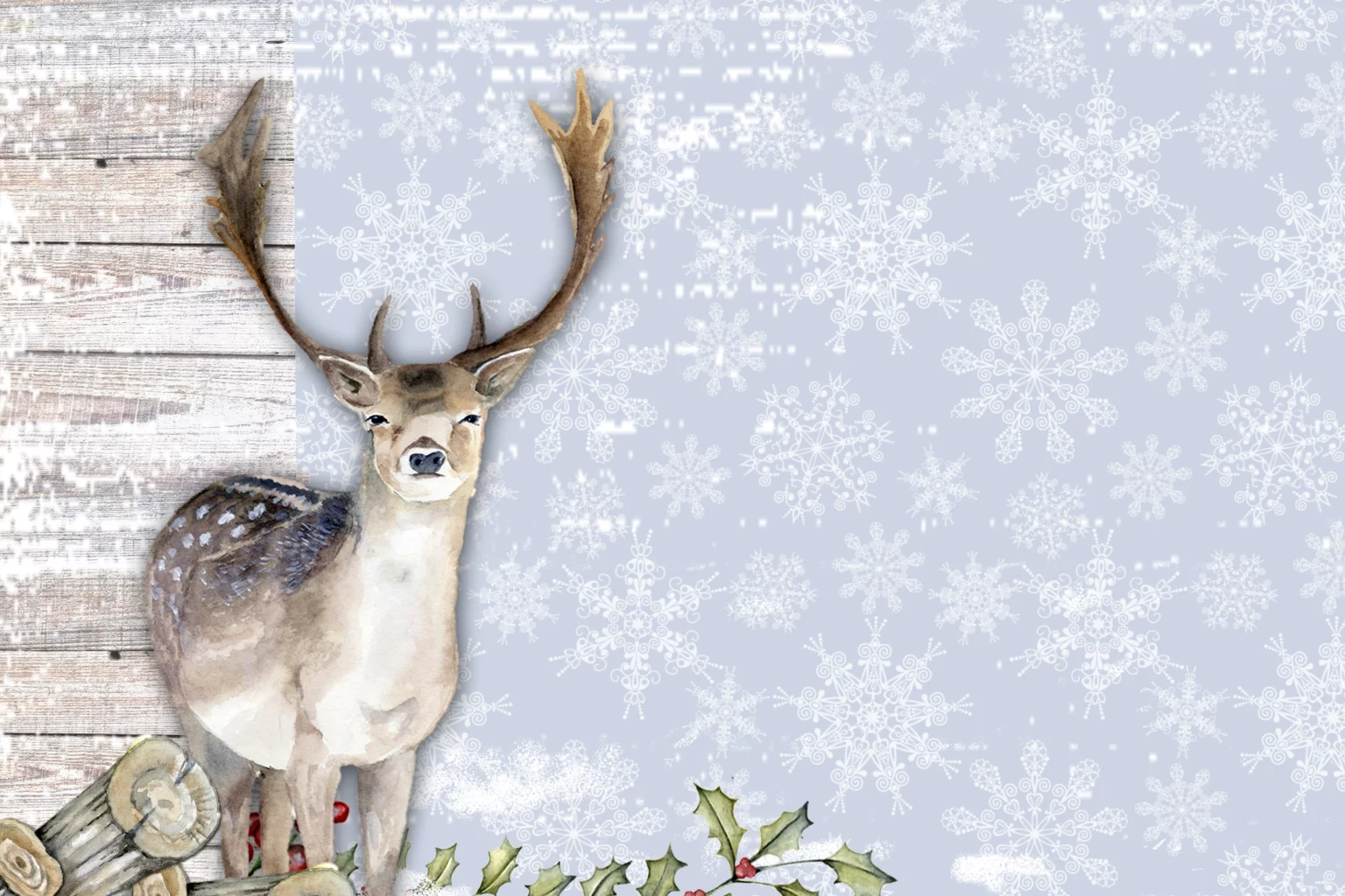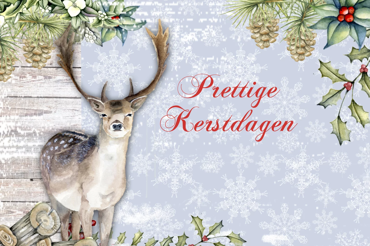 Kerstkaart met rendier winterlandschap omringt door hout en hulst.
