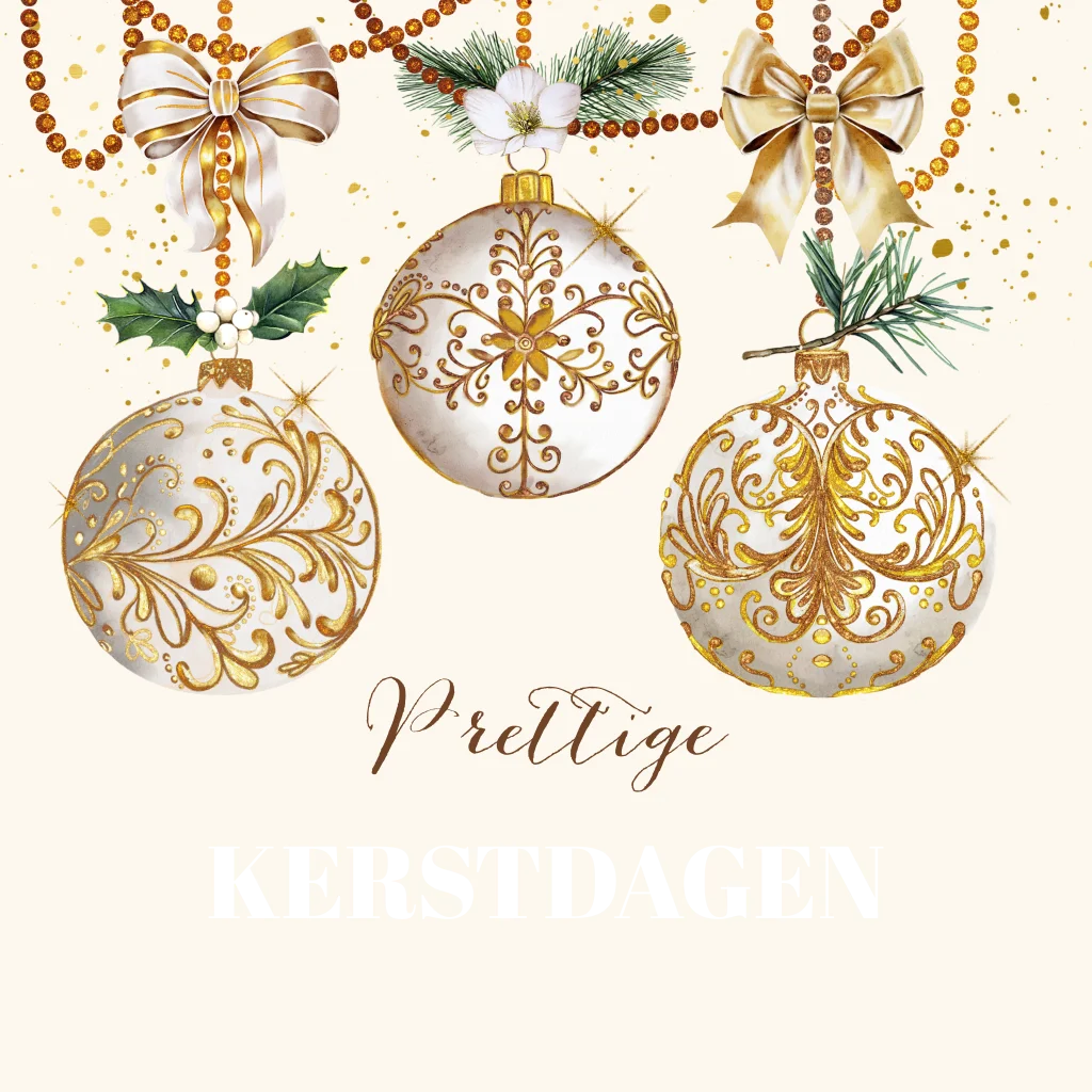 Kerstkaart met kerstballen aan strikken en ketting in het goud