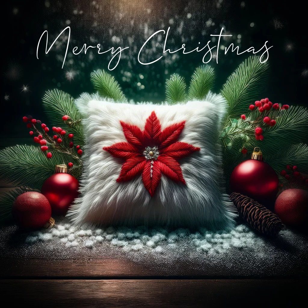Een sfeervol kerstkaartje met een kerstster liggend op een donzig kussentje.