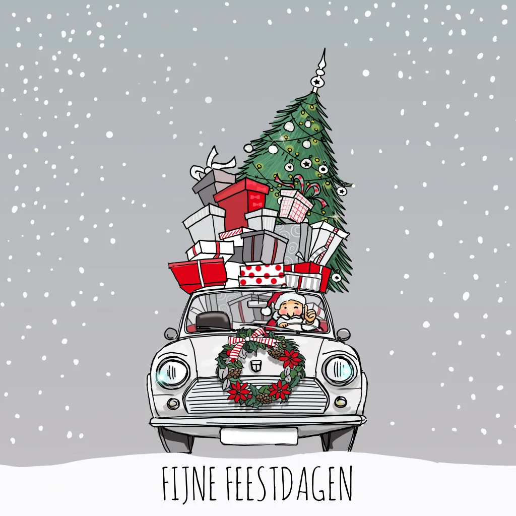 Grappige kerstkaart met kerstman in een volgeladen mini auto. Met bovenop een kerstboom en veel cadeautje. Deze kaart past goed bij een zilveren of rode envelop!