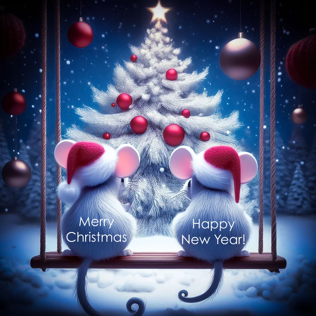 Een super lief kerstkaartje met twee muisjes op een schommel kijkend naar een witte kerstboom met rode kerstballen.