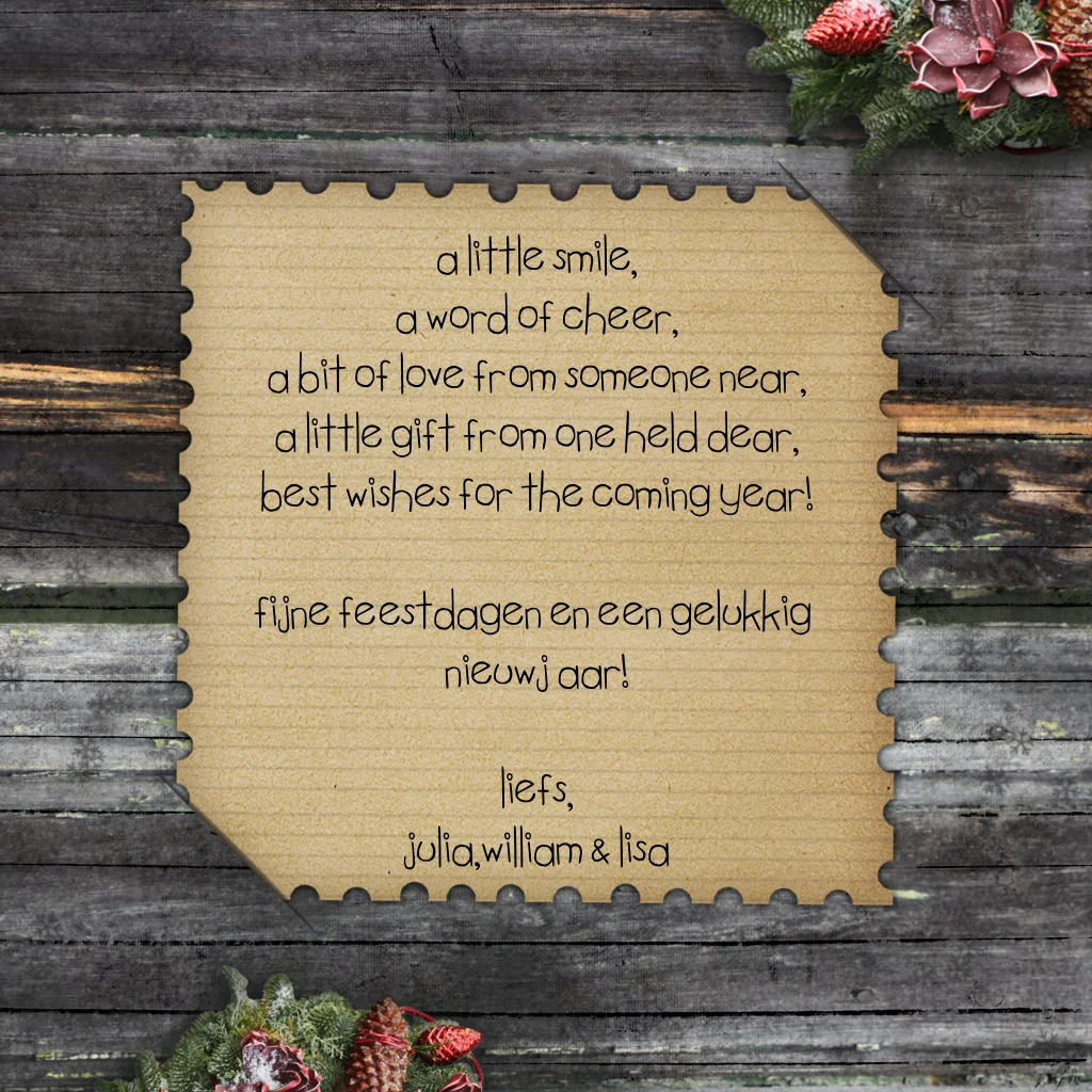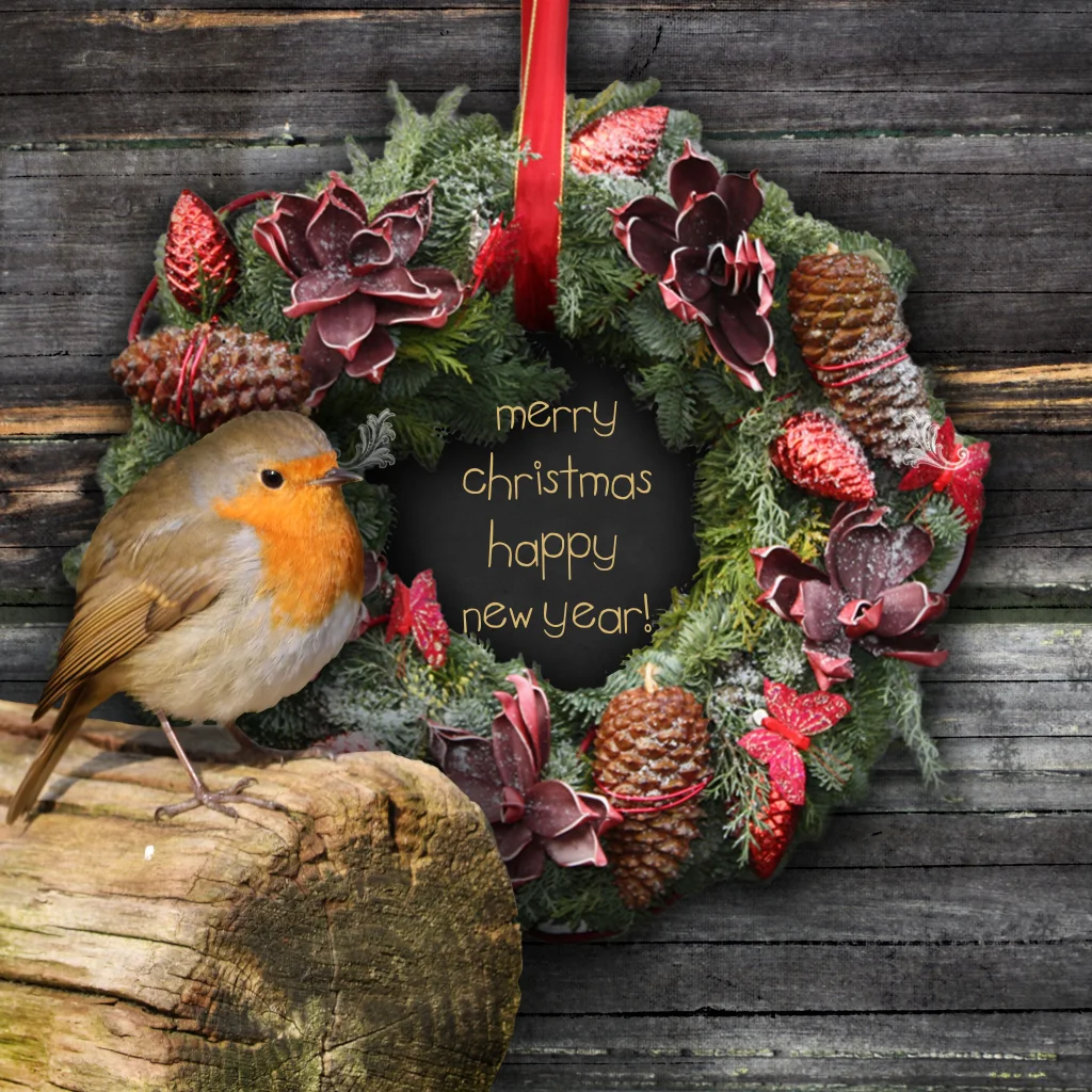 Een mooie sfeervolle kerstkaart met een roodborstje voor een kerstkrans. De tekst is aanpasbaar.Met bijpassende binnenzijde!