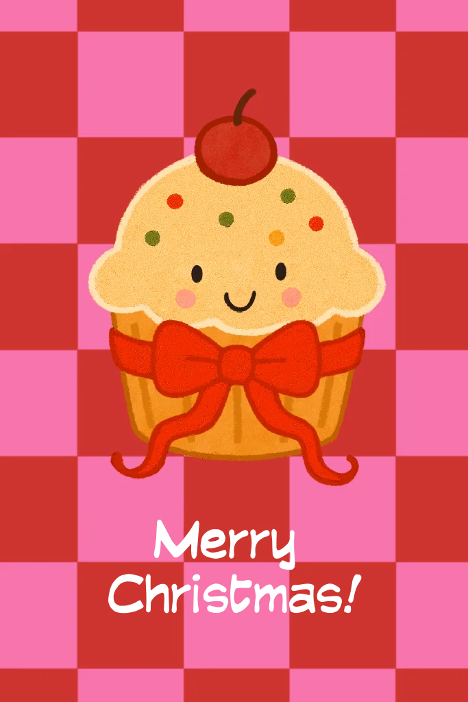 Deze vrolijke kerstkaart met cupcakefiguur brengt meteen dat gezellige decembergevoel naar boven. De moderne geblokte achtergrond in roze en rood geeft het ontwerp een frisse, trendy uitstraling die je niet snel ergens anders ziet. Samen met de vrolijke strik en kers bovenop wordt deze kaart een kleurrijke en unieke kerstgroet die echt opvalt.