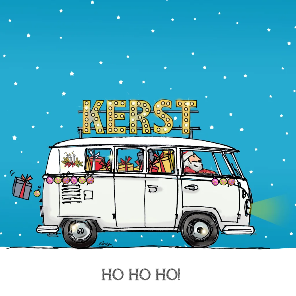 Grappig getekende kerst verhuiskaart met Volkswagenbusje