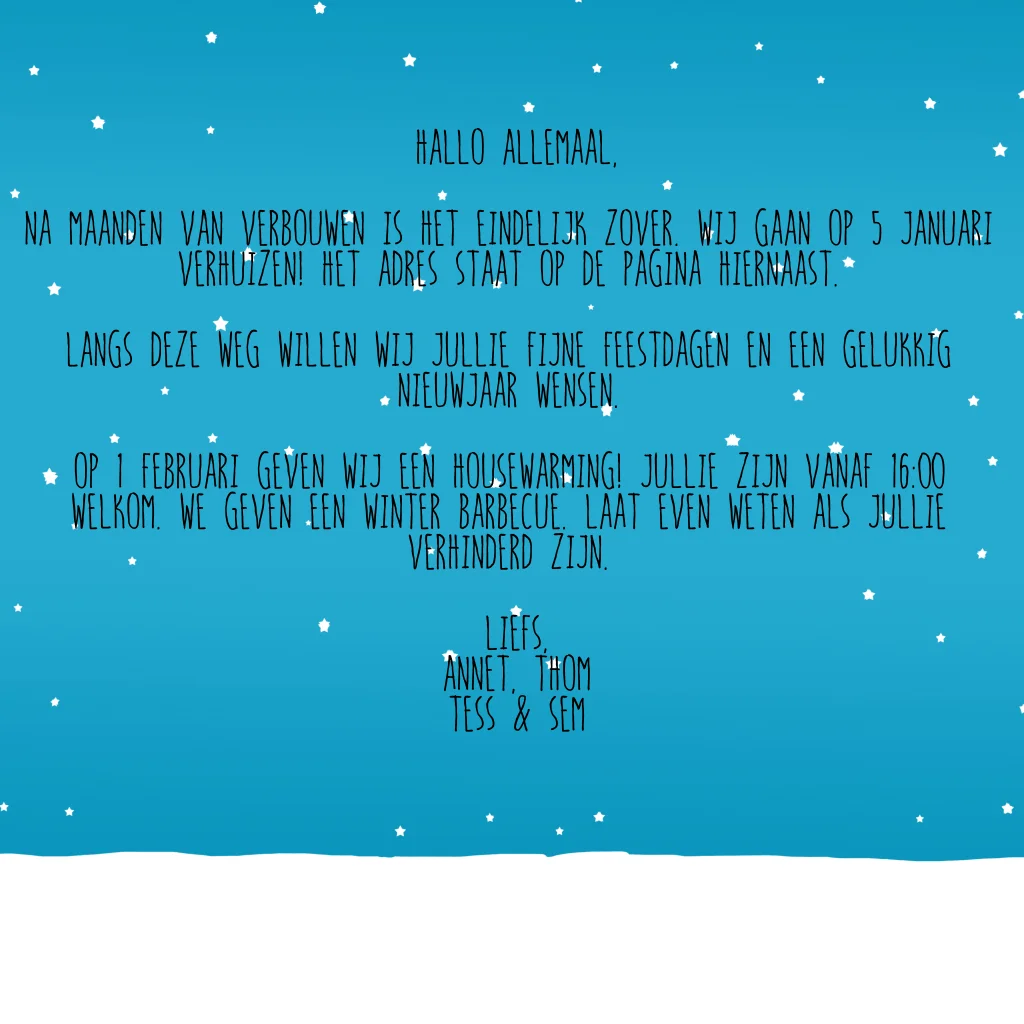 Handgetekende kerstkaart van Anet, vrolijk en leuk. Je kunt deze kaart gebruiken als 'normale' kerstkaart maar ook als kerst verhuiskaart. De kerstman en sneeuw geven deze kaart een nostalgisch gevoel.