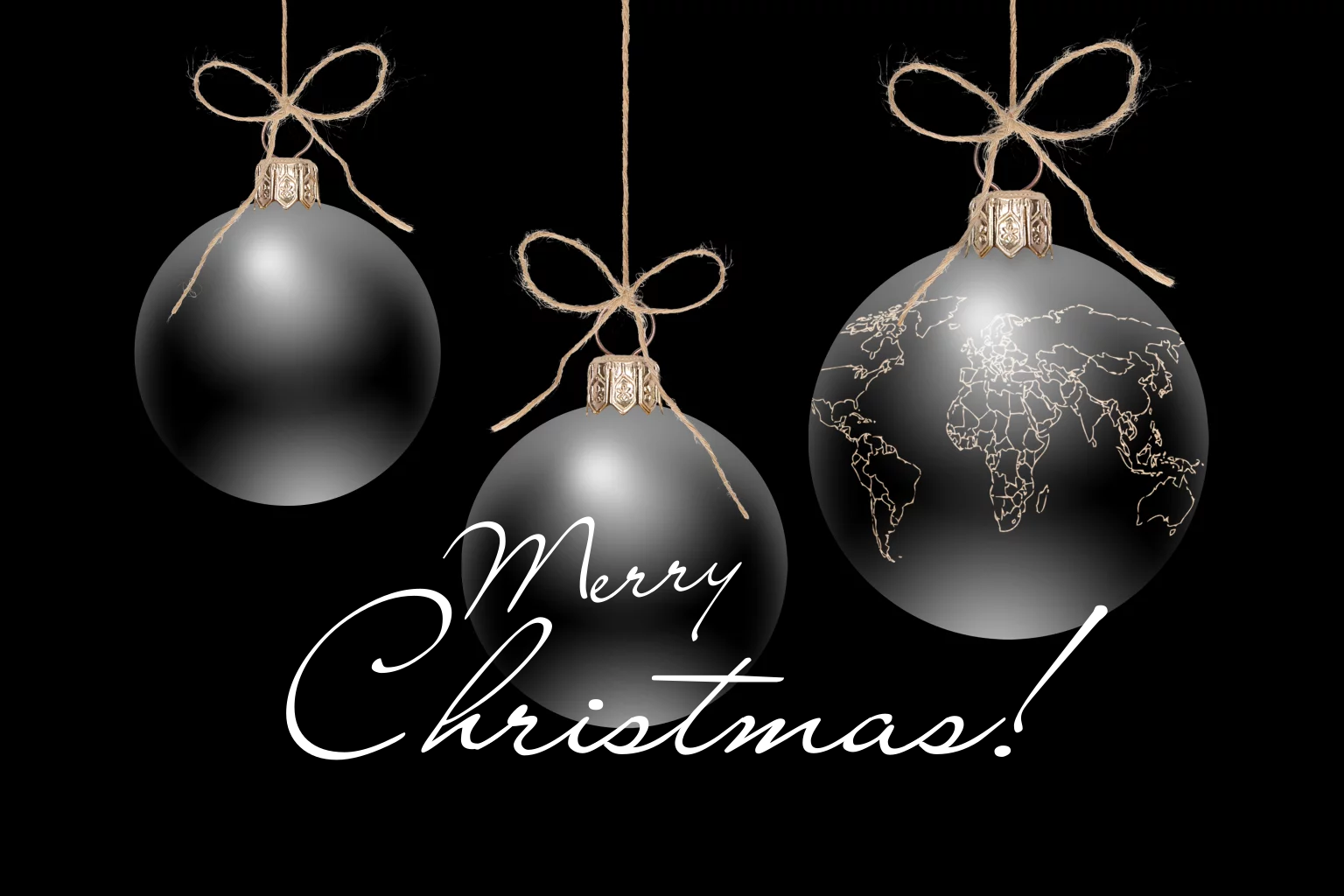 Een stijlvolle kerstkaart met een gouden wereld op een glazen kerstbal.