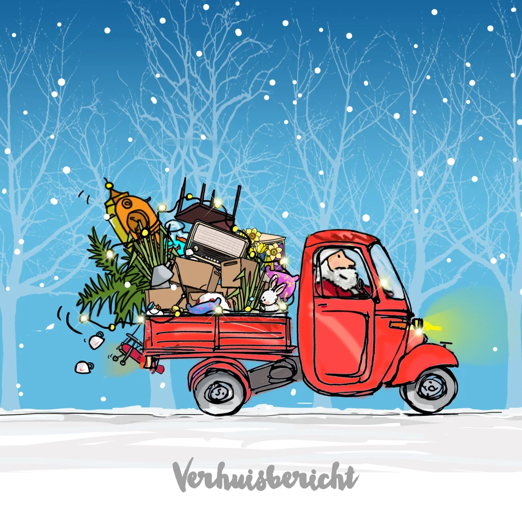 Origineel getekende kerstkaart met Vespa en verhuisspullen
