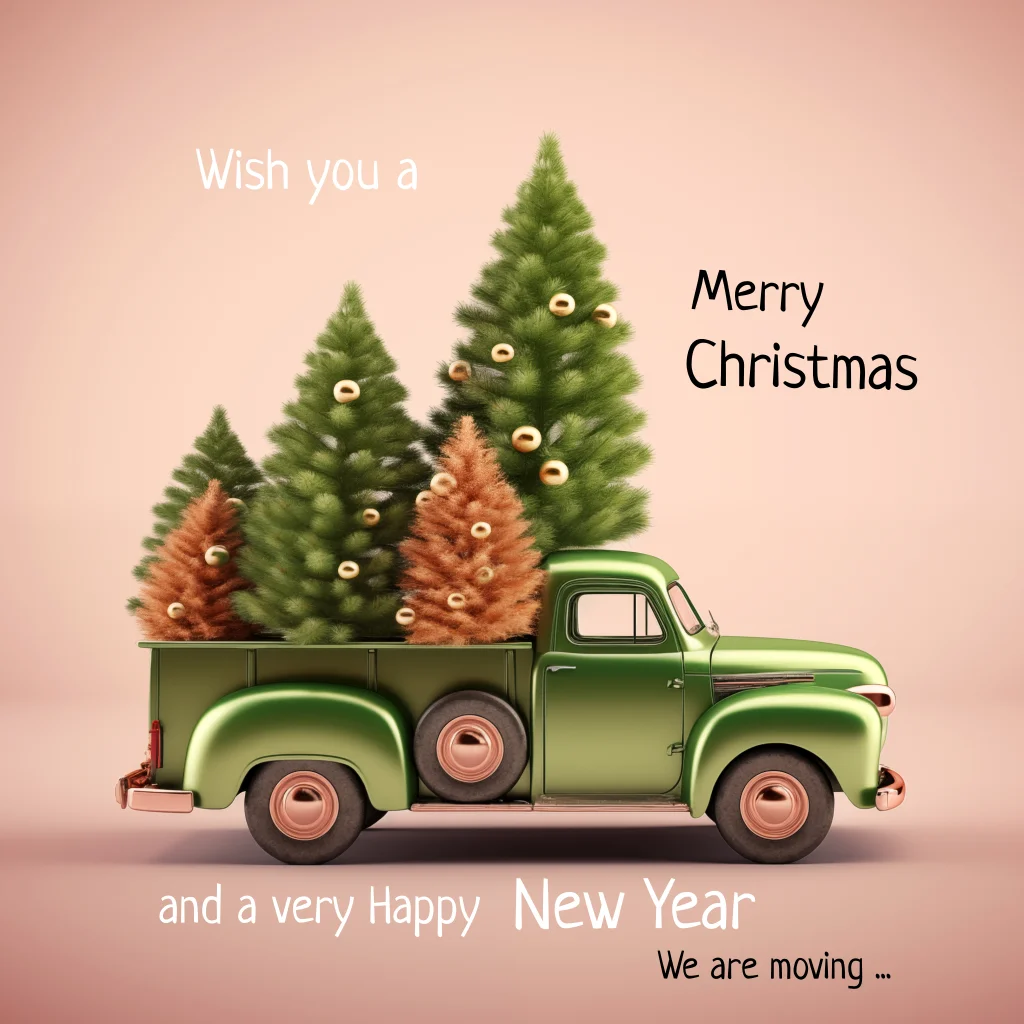 Superleuke kerst verhuiskaart. Met een retro truck en kerstbomen. Een echte 2 in 1 kaart. De kerst-verhuis kaart.