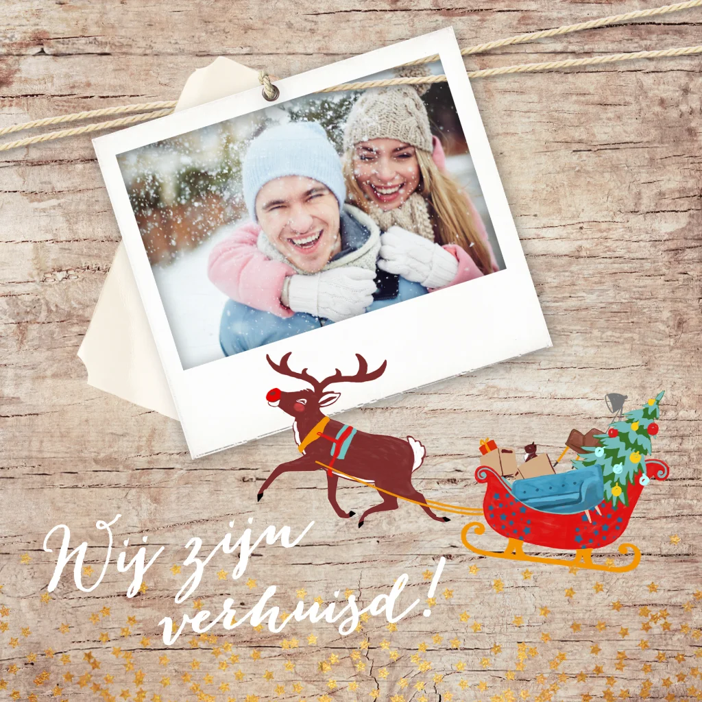 Vrolijke kerst verhuiskaart. Met deze kaart sla je twee vliegen in één klap. Leuk geïllustreerd met gouden sterren en een arrenslee op hout.