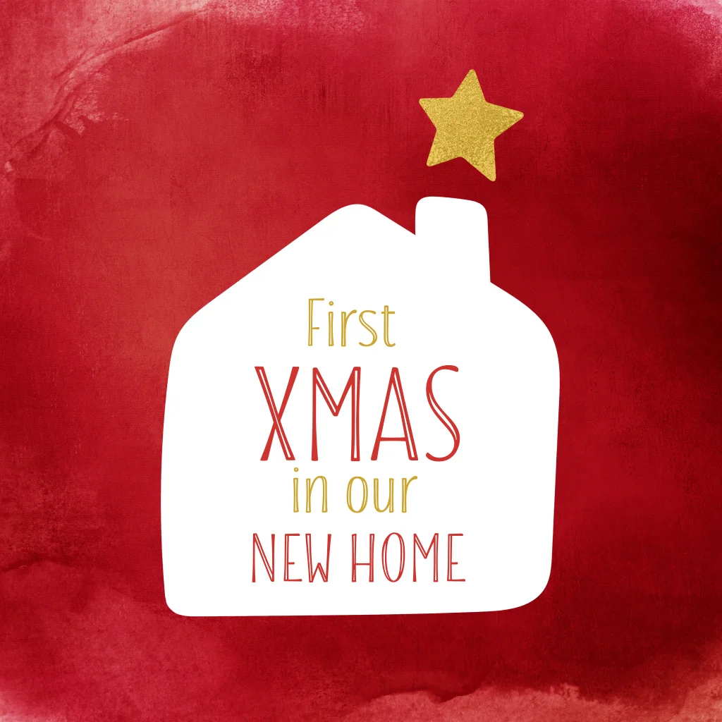 Prachtige kerst verhuiskaart. Donkerrode waterverf look achtergrond met wit huis en goudkleurige ster. Strak maar opvallend en mooi.