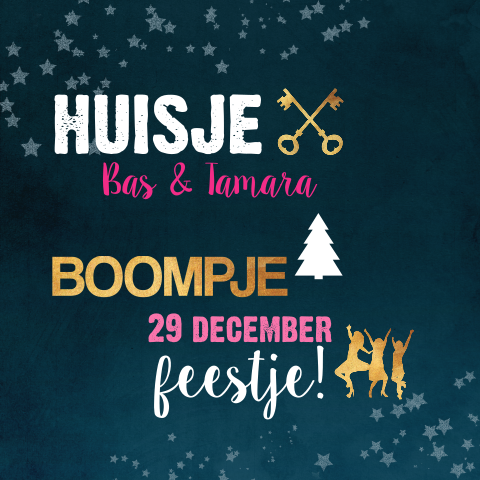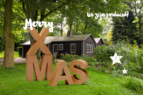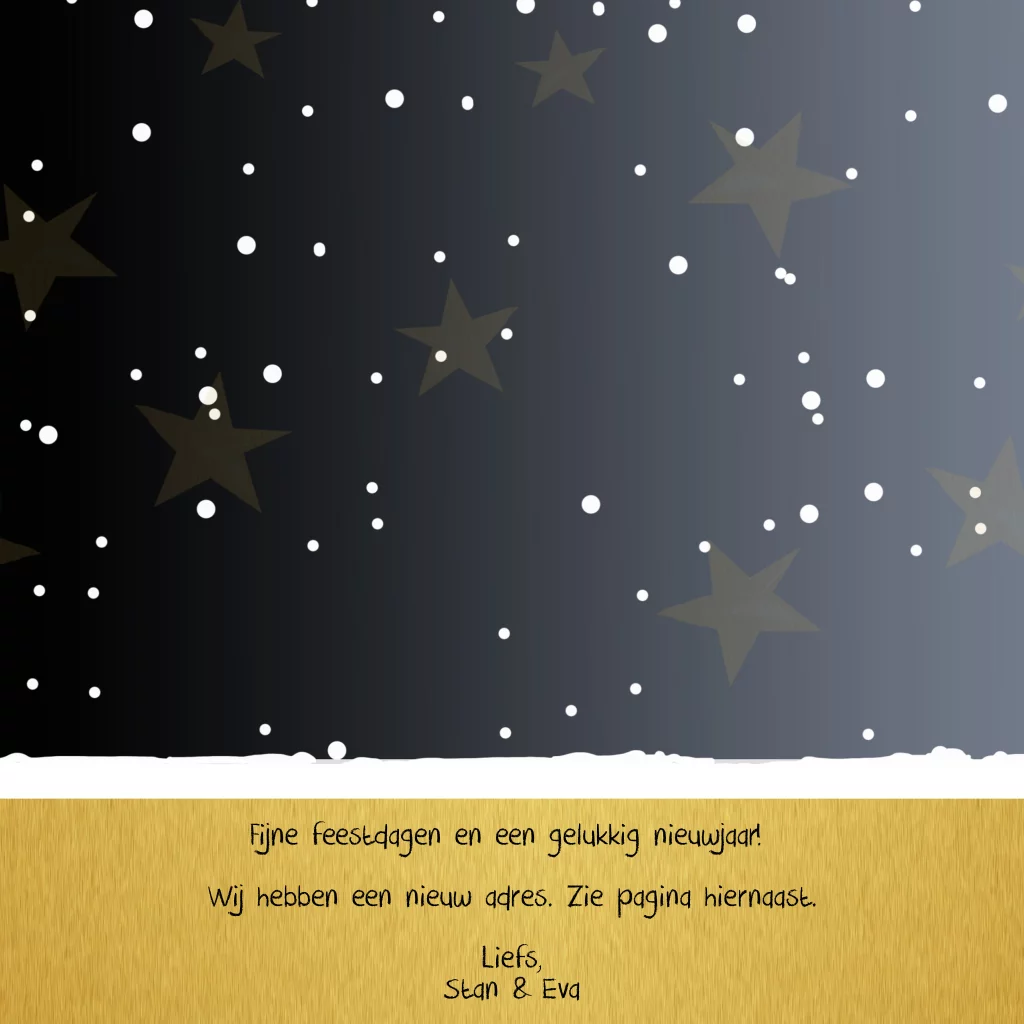 Originele kerstkaart ontworpen door Anet van de Vorst. Op de kaart staan sterren, een verhuisbusje en natuurlijk ontbreekt de kerstman niet.