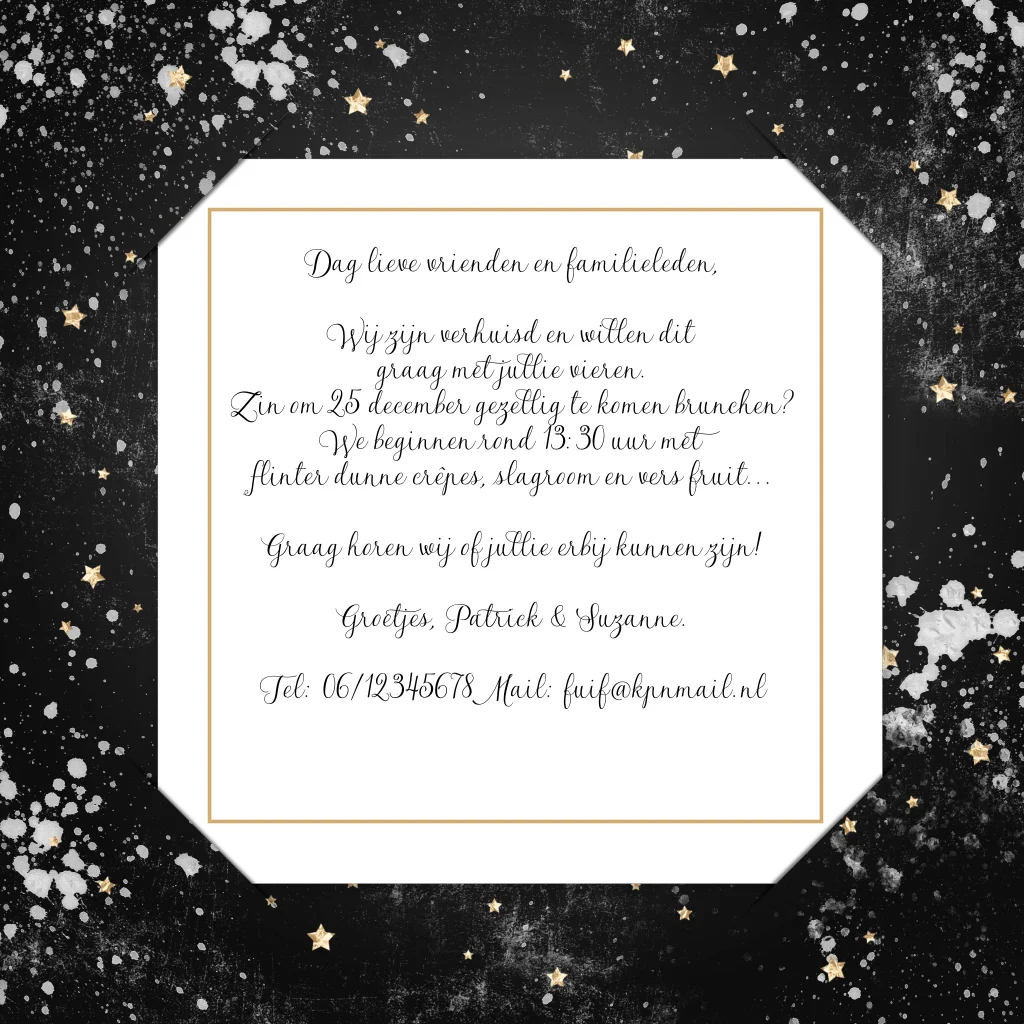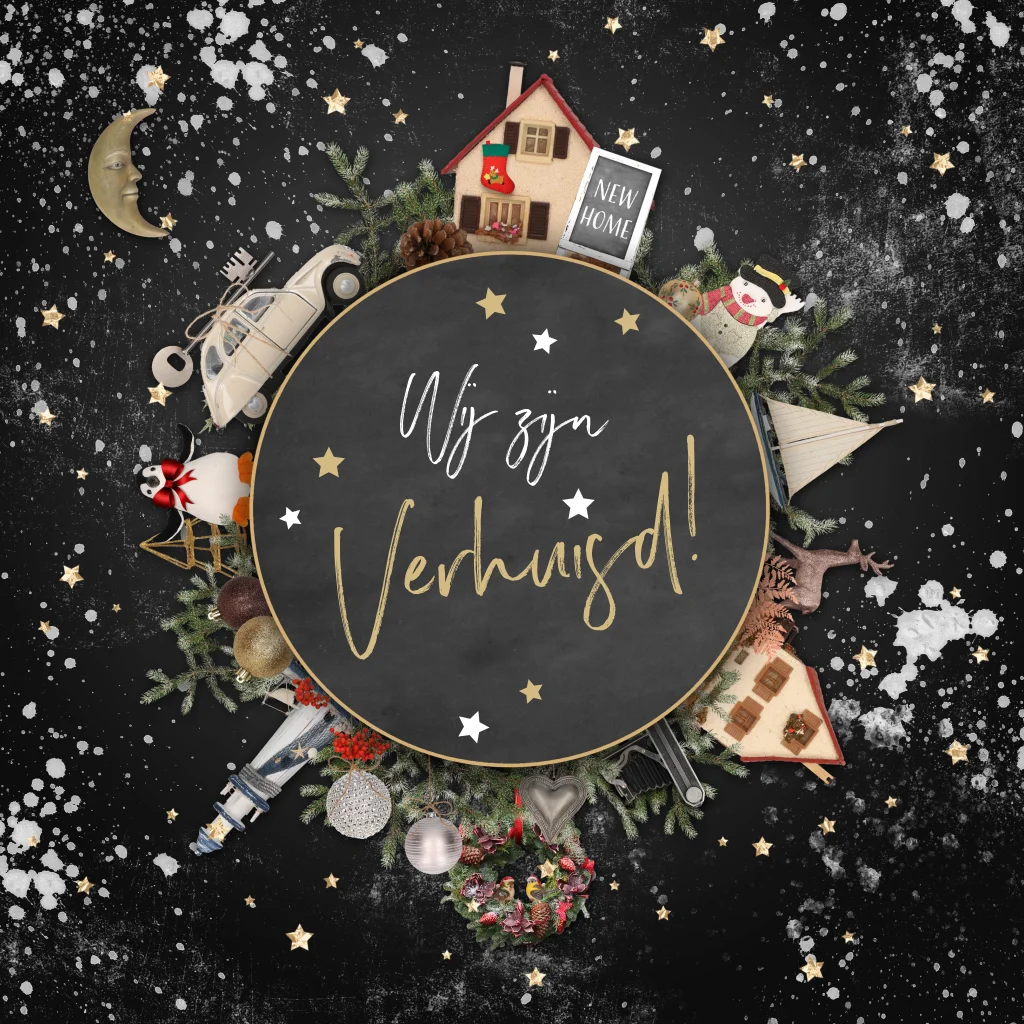 Een feestelijke verhuiskaart met vrolijke elementen als huisjes, sneeuwpop, kersttakjes, sterren en nog veel meer!