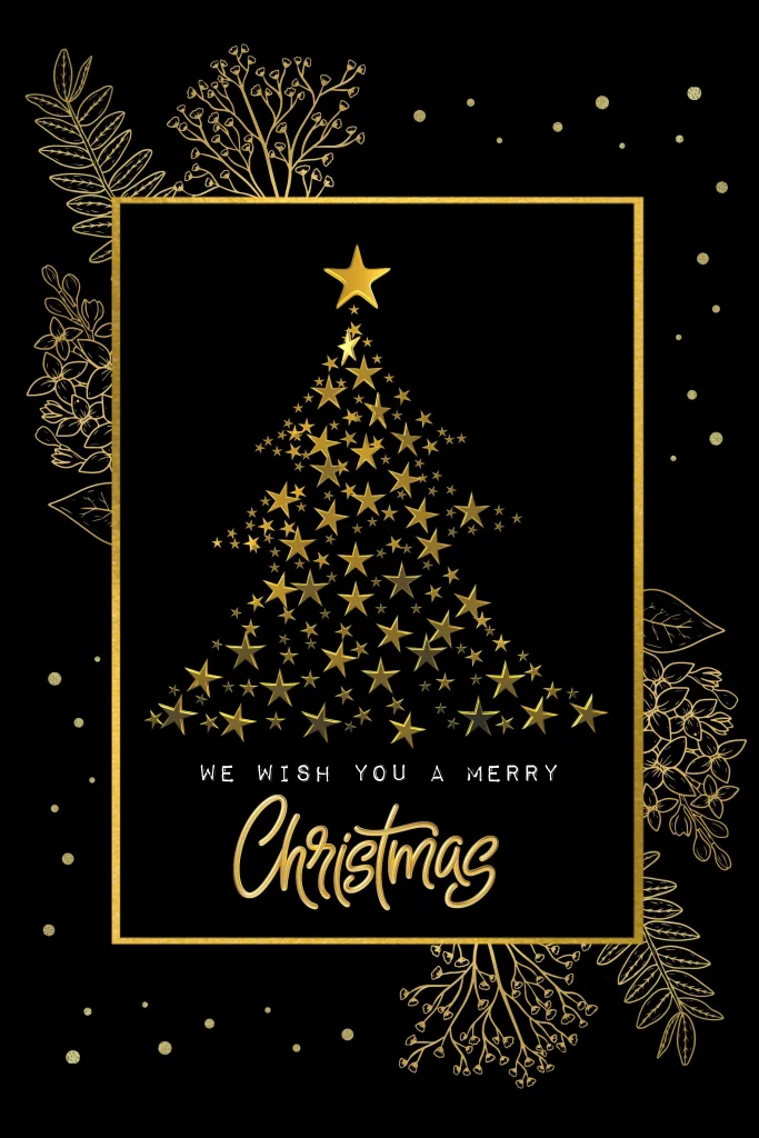 Stijlvolle zwart gouden kerstkaart met sterren en kerstboom. Op achterzijde ruimte voor eigen logo.