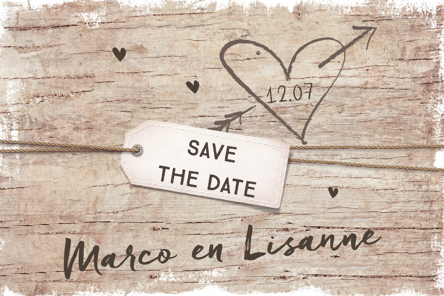 Stoere Save the Date kaart met houtlook, labeltje en getekend hartje met pijl. Deze kaart krijgt een structuur wanneer deze afdrukt op oud Hollands papier. Kies voor een bijpassende envelop en sluitzegel.