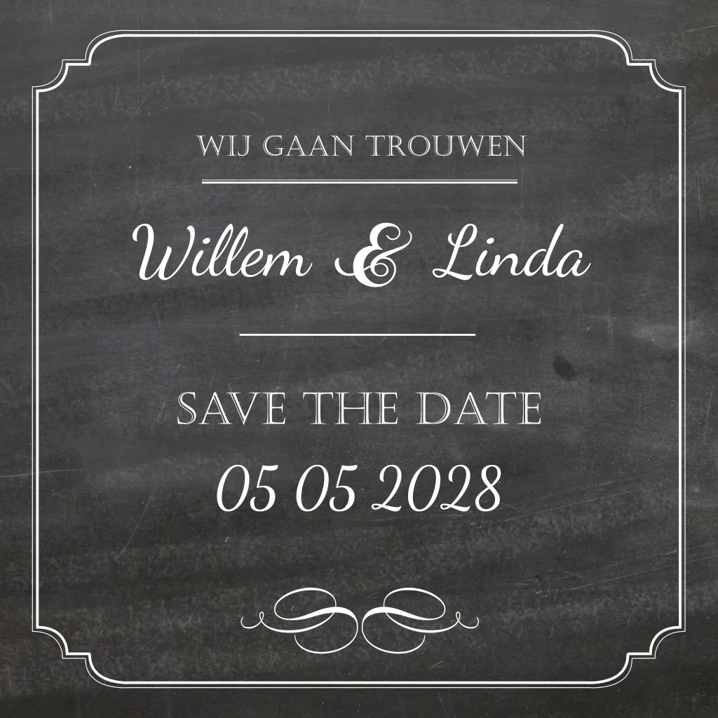 Originele kaart door de combinatie van klassieke opmaak en een hippe krijtbord achtergrond. Bekijk hier de bijpassende trouwkaart.