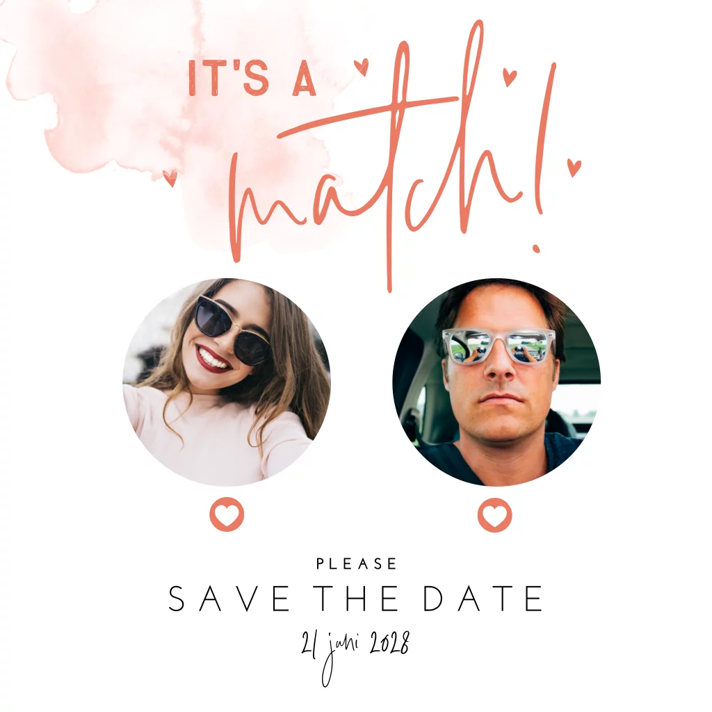 Save the Date Card it's a match. Hebben jij en je aanstaande elkaar leren kennen via Tinder? Dan is dit de perfecte Save the Date voor jullie!