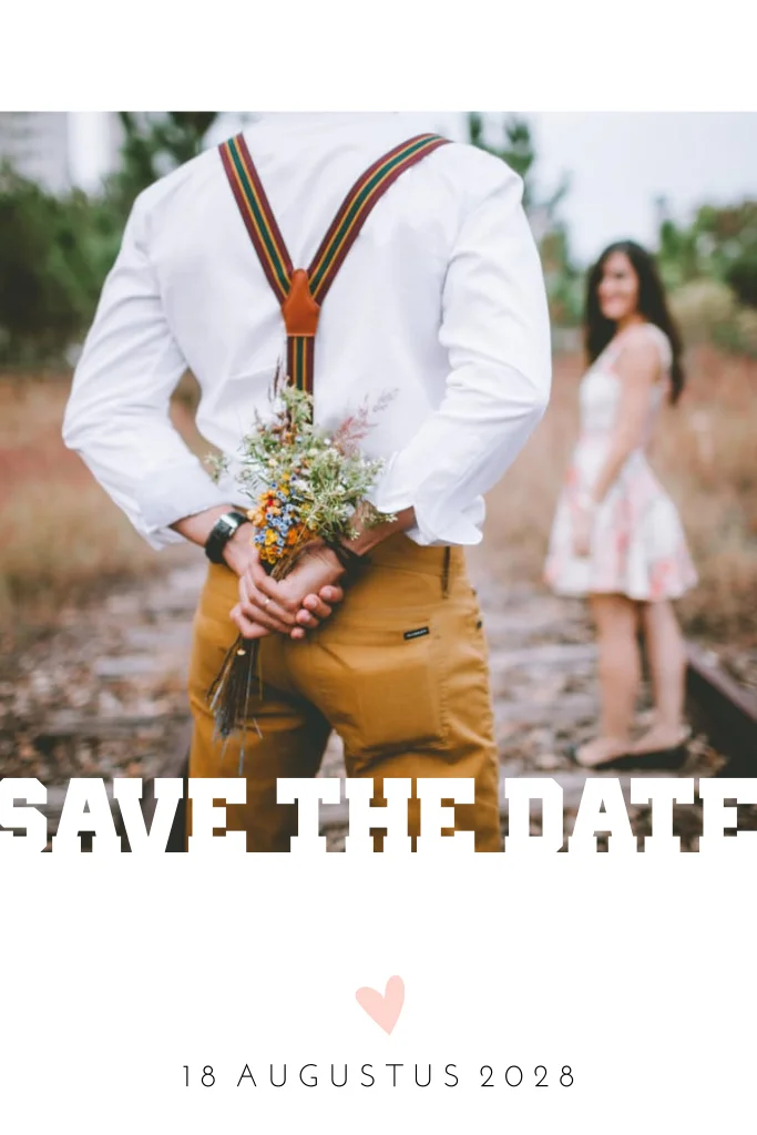 Stijlvolle Save the Date kaart met ruimte voor een persoonlijke foto. Tip! Pas de kleur van je envelop aan op de kleur van het lettertype dat je gaat gebruiken.