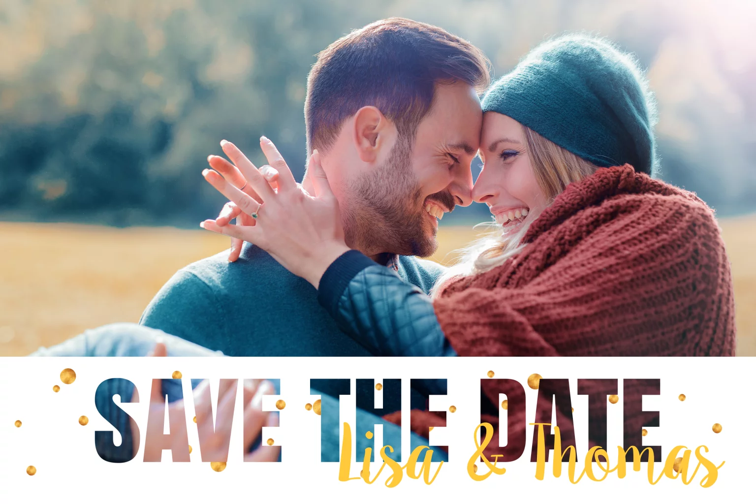 Deze feestelijke Save the Date kaart met fototekst wordt extra vrolijk gemaakt door de toevoeging van de gouden confetti. En persoonlijk door de foto van jullie samen. En er is ook een bijpassende trouwkaart!