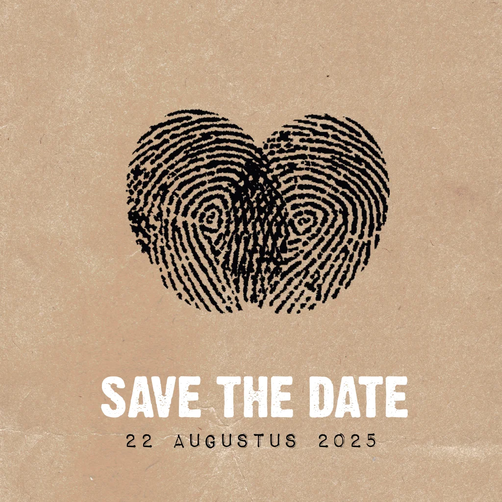 Save the Date kaart met kraftlook achtergrond en twee vingerafdrukken die samen een lief hartje vorm. Tip! Druk deze kaart af op oud Holland papier, dat geeft een mooi structuur aan de kaart.