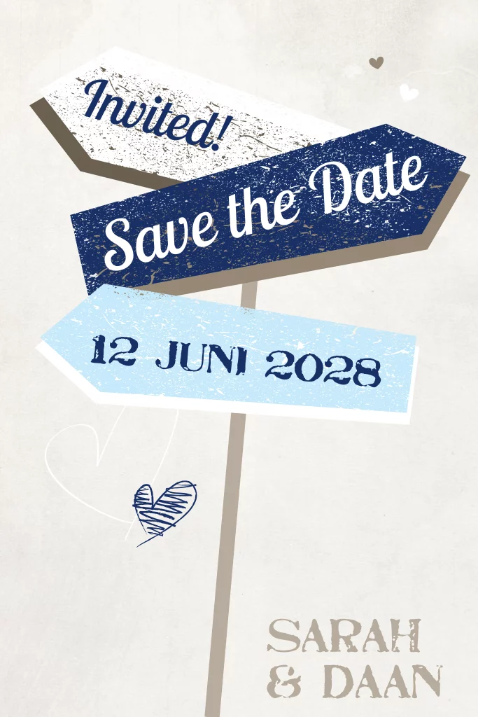 Save the date kaart met vrolijke blauwe wegwijzer. De tekst op de houten bordjes kun je geheel naar wens aanpassen. Mooi met een bijpassende keur envelop!