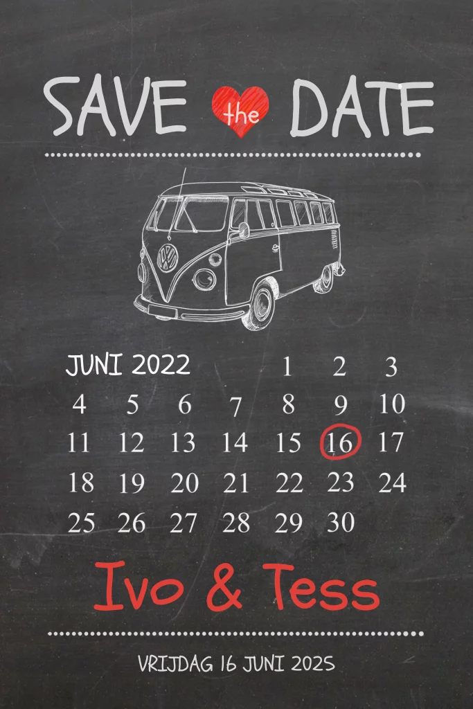 Save the date kaart met stoere vw bus. Het rode hart steekt vrolijk af tegen de donkere schoolbord achtergrond. Bekijk hier de bijpassende trouwkaart.