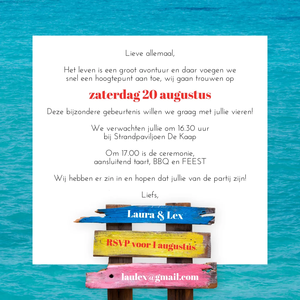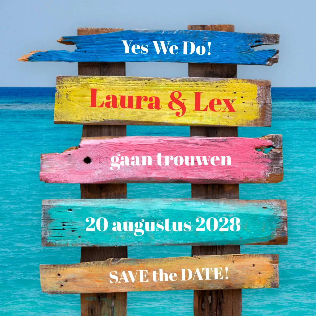 FLEURIGE en TRENDY uitnodiging voor jullie TROUW feest. De teksten op de houten bordjes kun je veranderen. Is jullie feest of honneymoon in tropische sferen, dan past deze kaart helemaal.