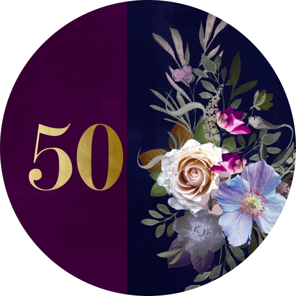 Stijlvolle sluitzegel voor een 50 jarig huwelijksjubileum. Het jaartal en de teksten zijn naar persoonlijke wensen aan te passen. Past dus bij alle jubileumjaren. Mooie annemoon en roos sieren de sluitzegel.