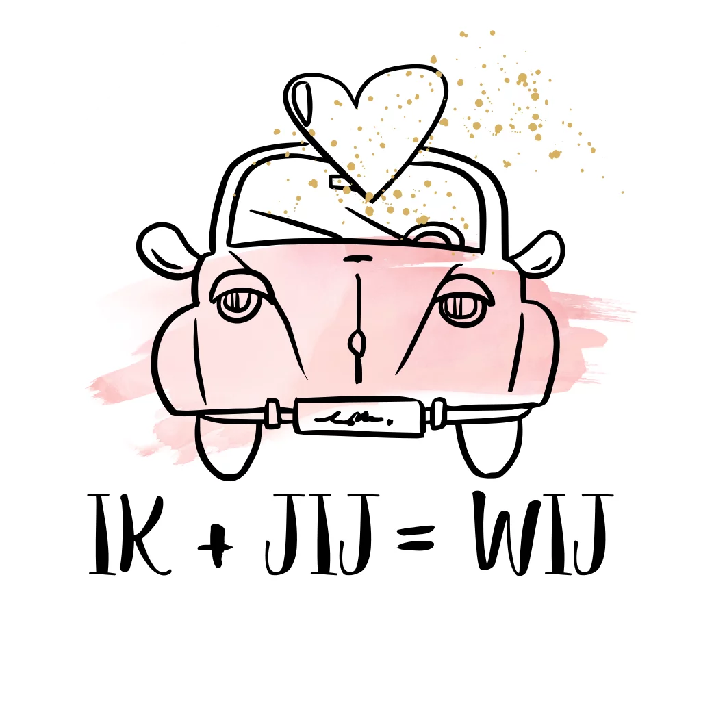 Ik en jij = wij! Vrolijk geïllustreerde sluitzegel met auto, roze watercolour elementen en grafisch gouden details.