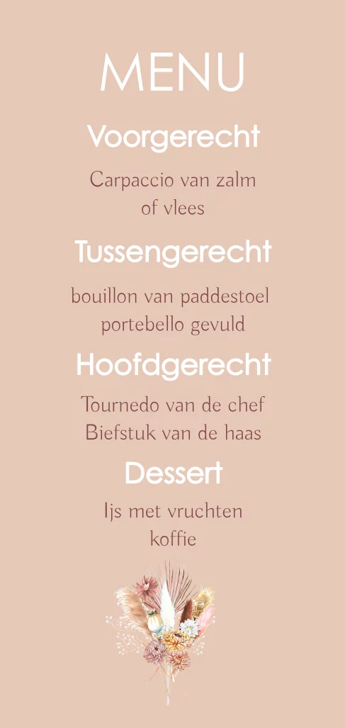 Menu voor trouwen met mooie dreamcather gevuld met droogbloemen.