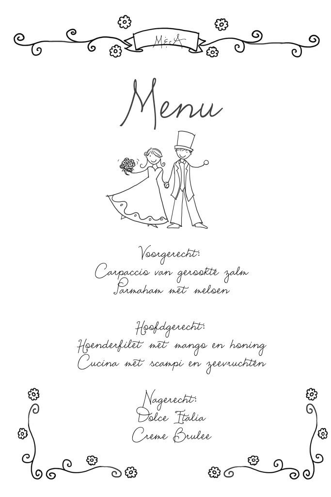 Leuke menukaart met getekend bruidspaar