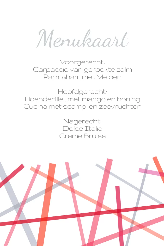 Rustige menukaart in strakke strepen en mooie kleur rood, passend bij trouwkaart