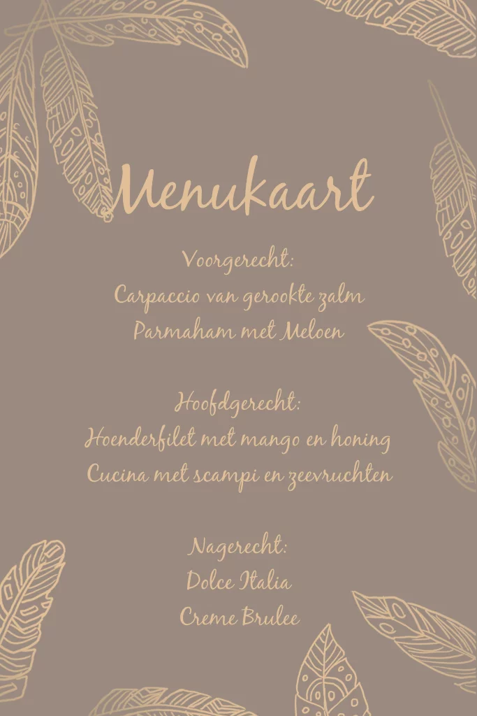 Menukaart met handgetekende veertjes en bruine achtergrond. Achtergrond is aanpasbaar. Bekijk hier de bijpassende trouwkaart.