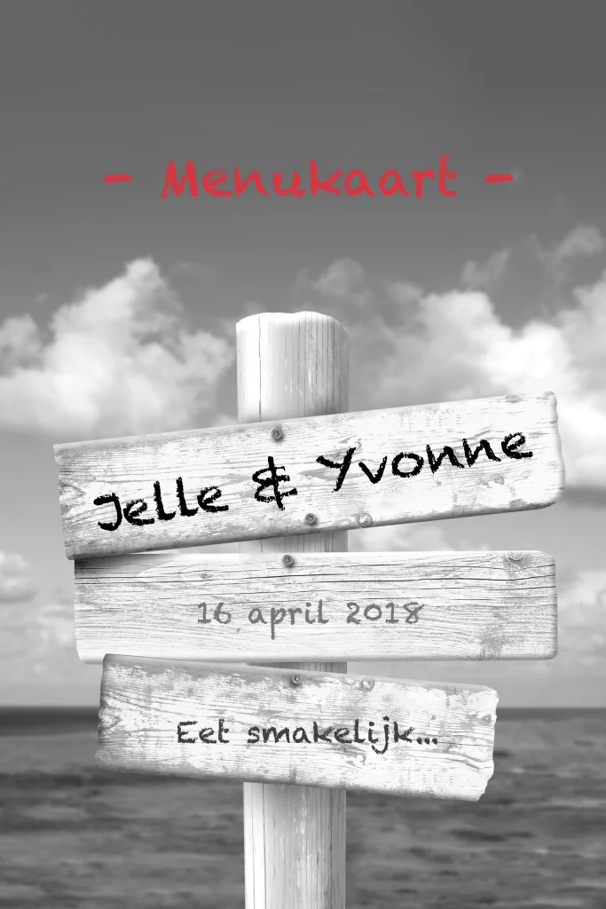 Hippe kaart met wegwijzer op het strand, te gebruiken als menukaart voor jullie trouwdag.