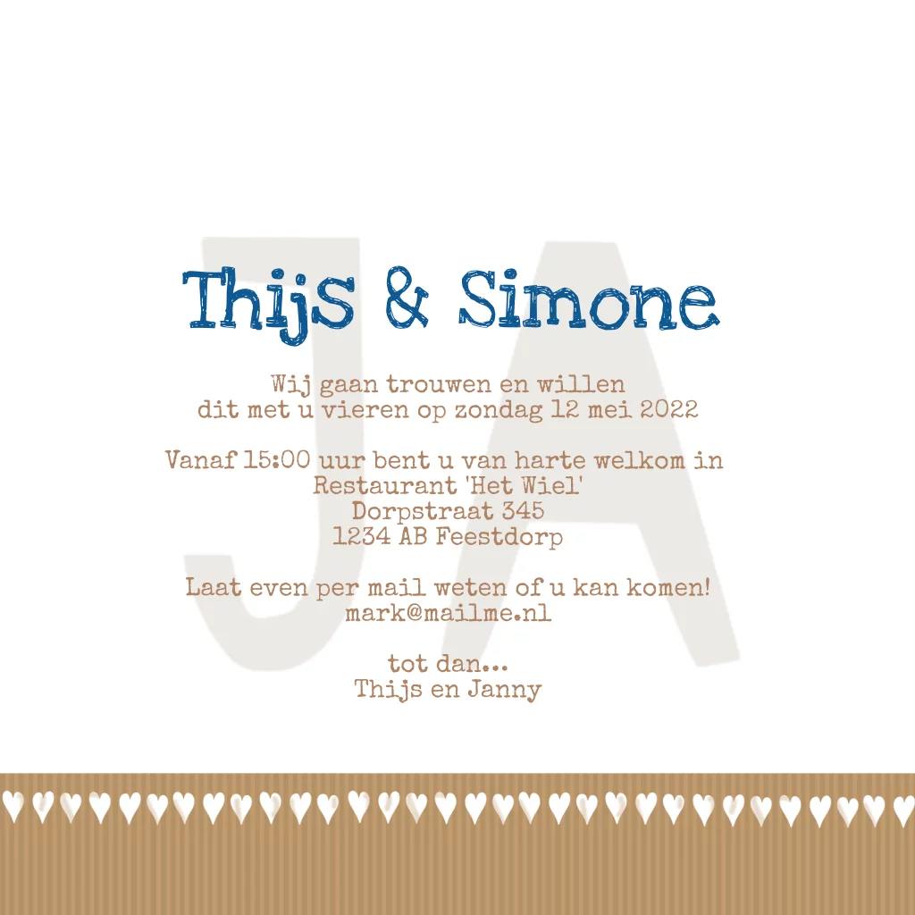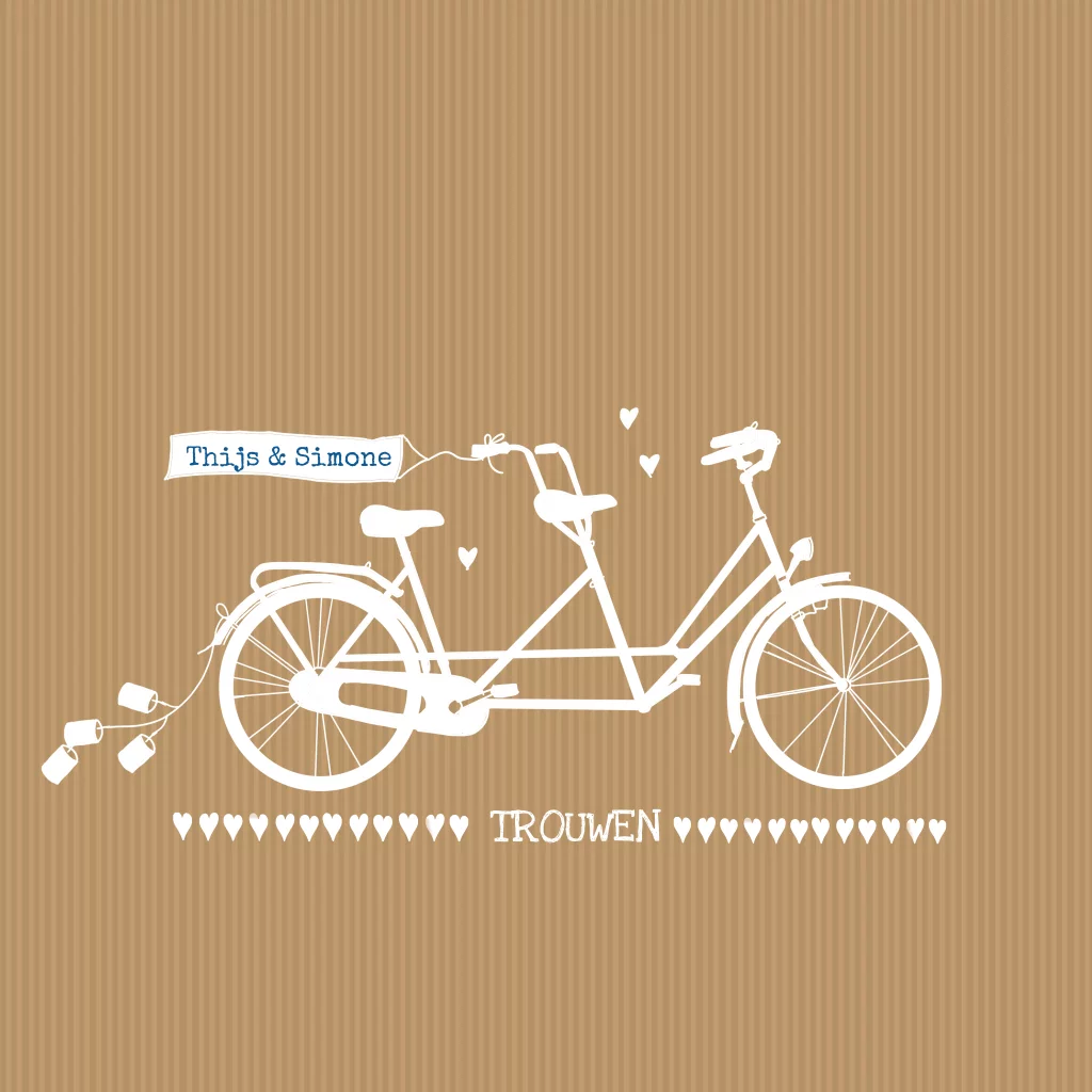 Kekke grafische kraftpapieren trouwkaart met vlaggetjes en fiets. Leuk & origineel. Tip: Maak de trouwkaart compleet met een echte kraftpapier envelop. Bestel de envelop bij het afronden van je bestelling voor slechts €0,25 per stuk.