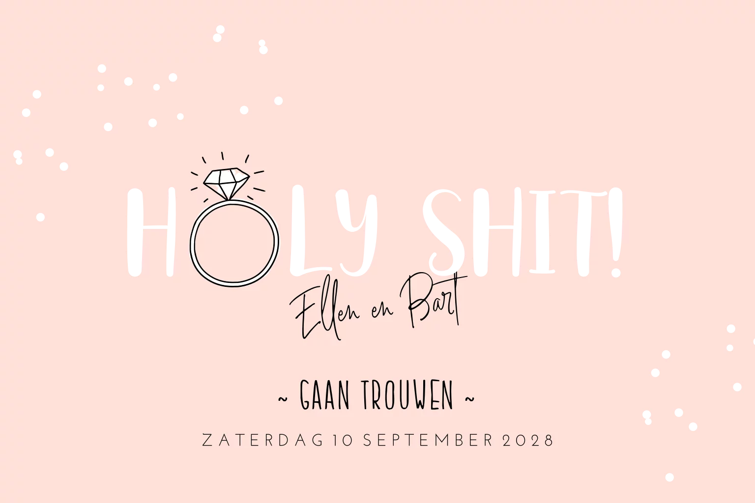 Trouwkaart roze met de tekst 'Holy shit'. De ring met grote diamanten ring maakt deze grappige trouwkaart helemaal af.