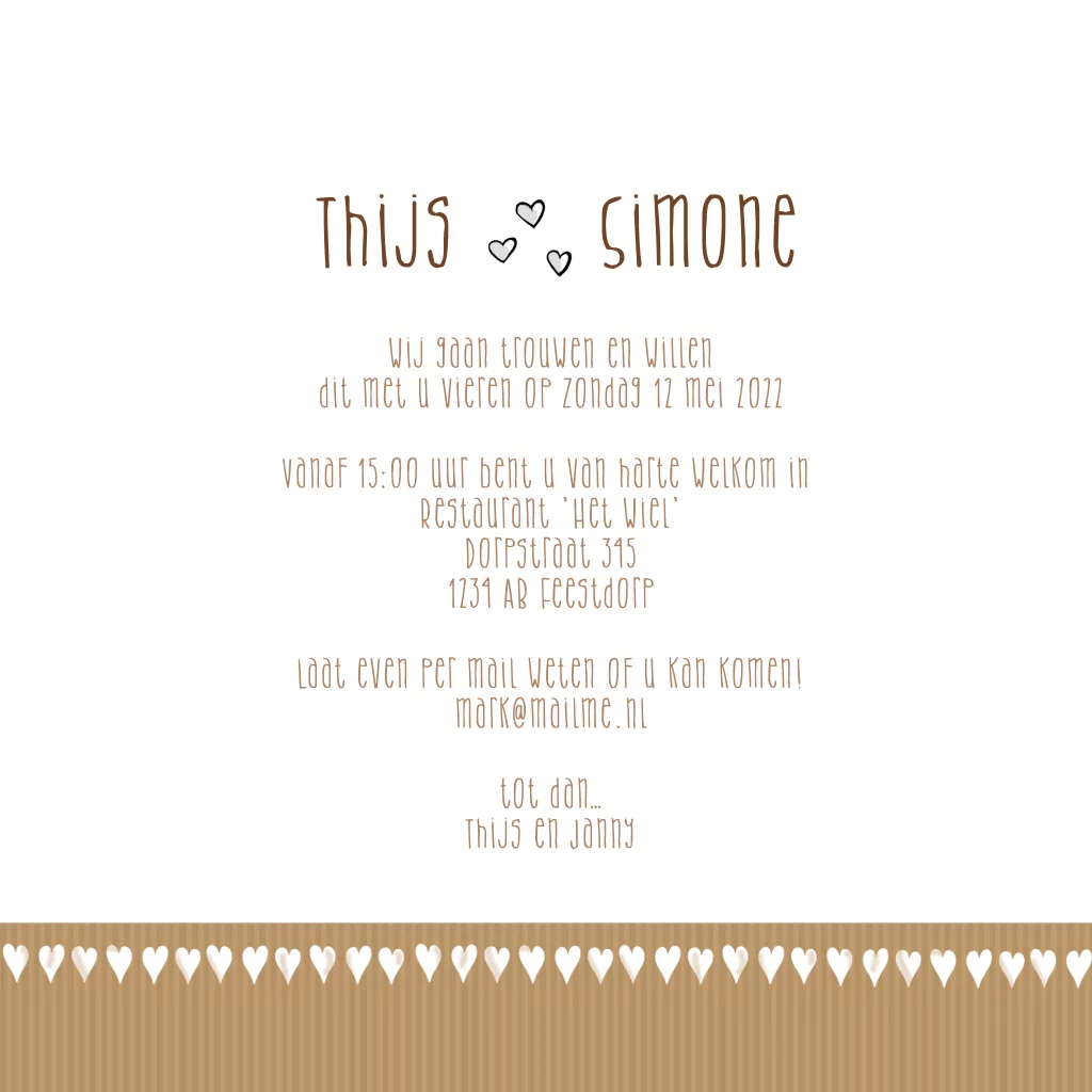 Mooi en illustratief trouwkaartje met kartonnen achtergrond. De binnenkant is stijlvol en chic.