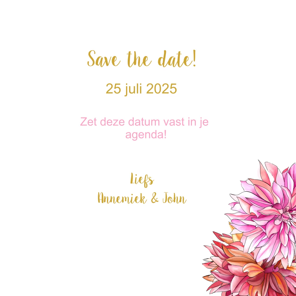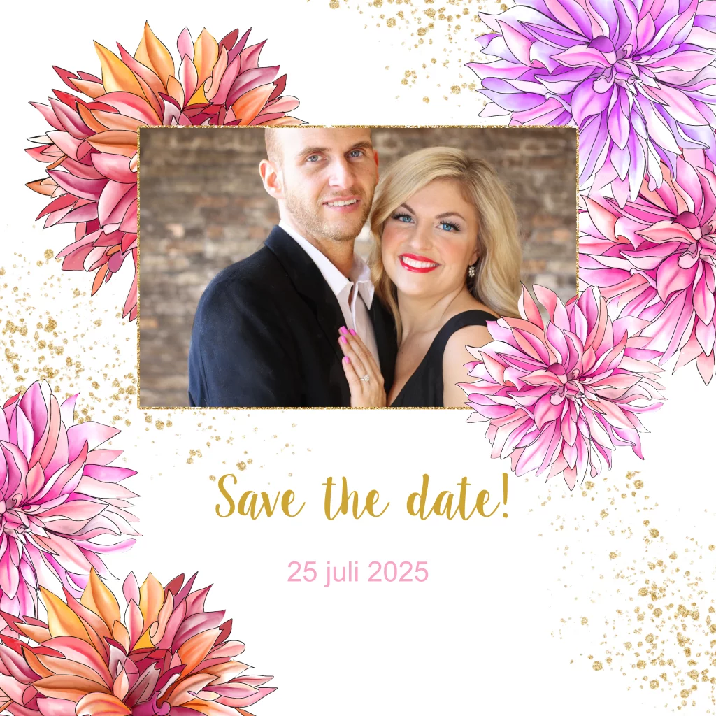 Save the date kaart met mooie kleurrijke dahliabloemen en ruimte voor een persoonlijke foto. Pas de tekst gemakkelijk zelf aan. De paars, roze, oranje tinten passen goed bij elkaar. Leuk om een envelop in een van die kleuren te kiezen!