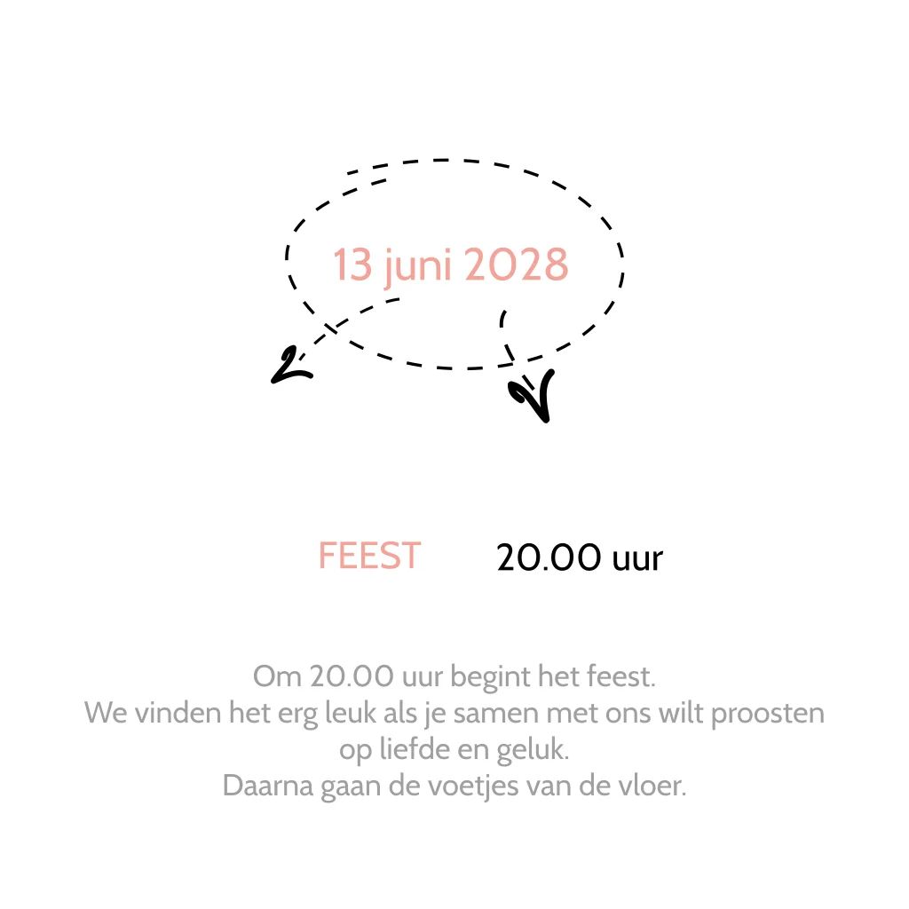 Hippe uitnodiging voor een bruiloft met originele tekst. Bekijk hier de bijpassende save the date-kaart.