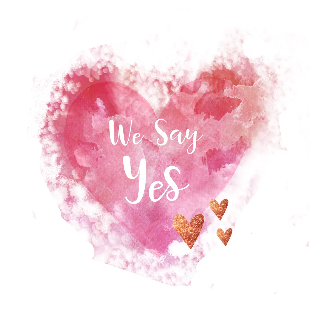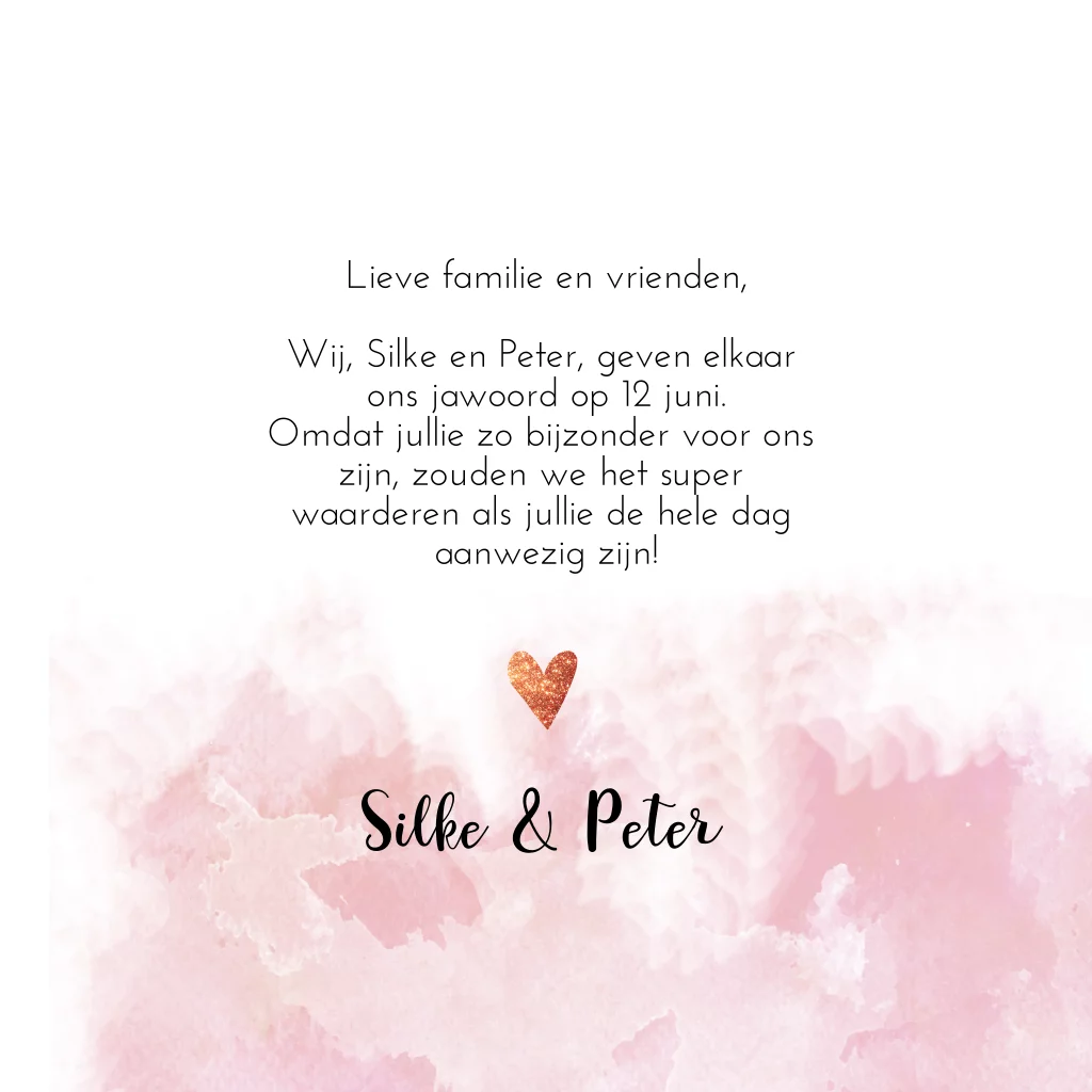 Maak deze liefdevolle trouwkaart voor jullie trouwfeest. Met mooi roze watercolor hart en kleine goudkleurige hartjes ernaast. Een liefdevolle start voor jullie bruiloft. Mooi met een bijpassende envelop en sluitzegel.