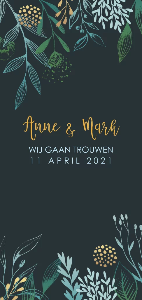 Mooi deze trouwkaart in botanische stijl. Versierd met takjes en bloemen in een turquoise kleurenpalet. Deze kaart past ontzettend goed bij onze petrol envelop. Tip! bestel een proefdruk van je kaart. Daarbij ontvang je al onze papier en envelopsoorten.