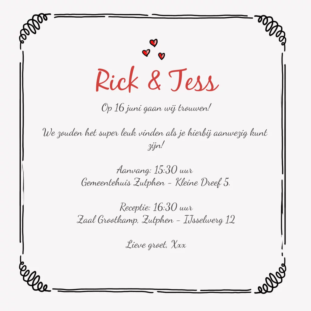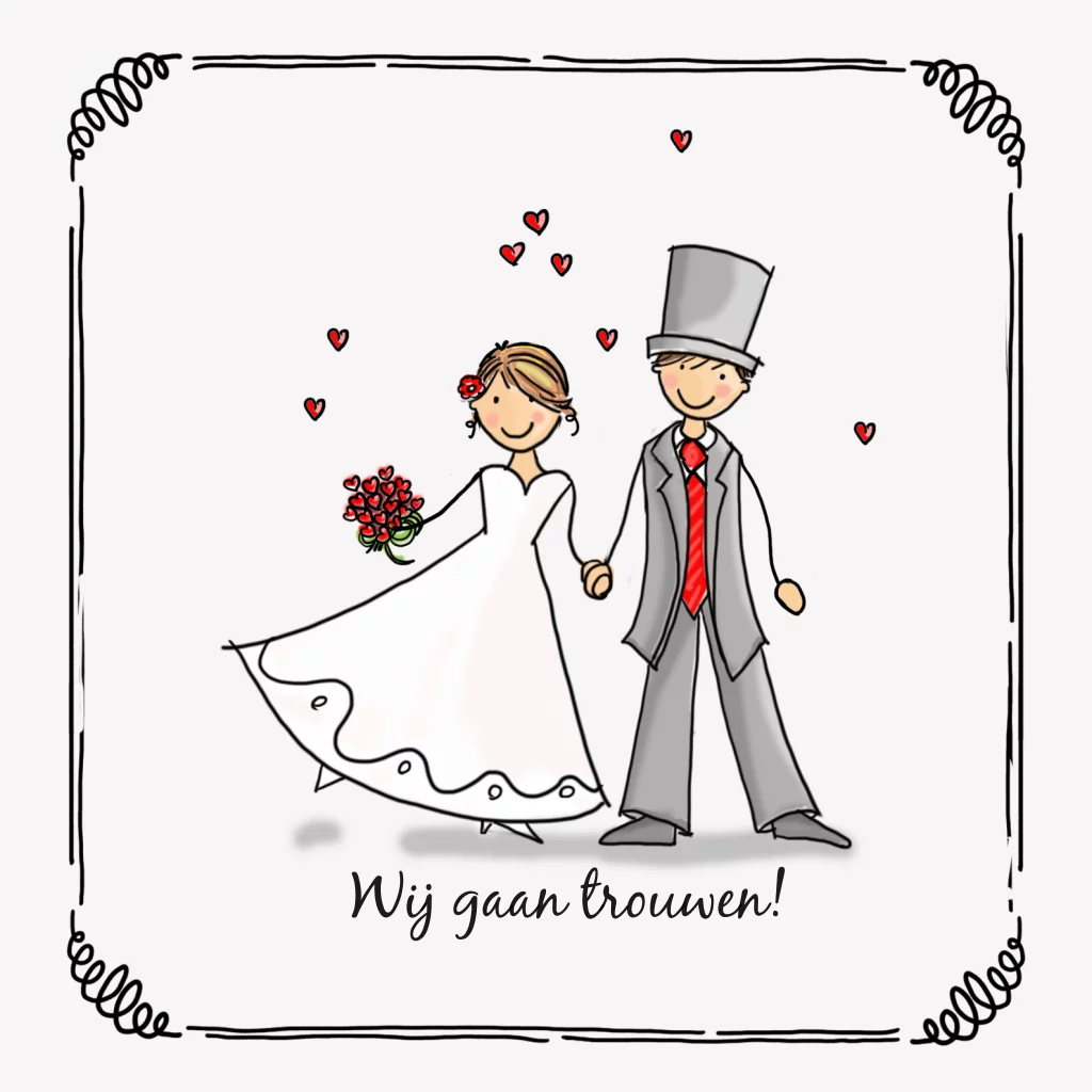 Vierkante trouwkaart met getekend bruidspaar en rode accenten. De kaart wordt afgemaakt door een leuke rand. Bekijk hier het bijpassende bedankkaartje.